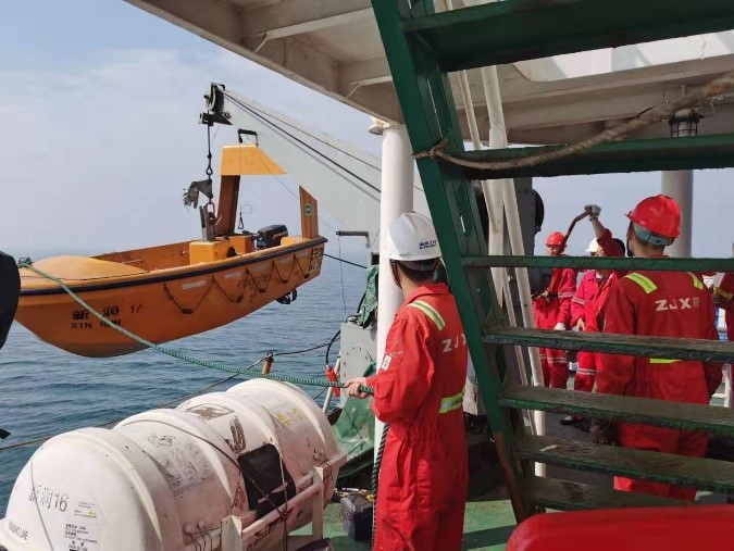 演习中面对突发“火灾险情”,新润 16立即启动船舶应急预案,拉响警报,全船集合,探火,多种方式灭火(灭火器、 CO 2、应急消防泵出水),释放救助艇。