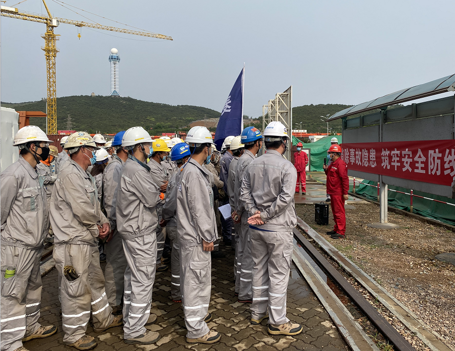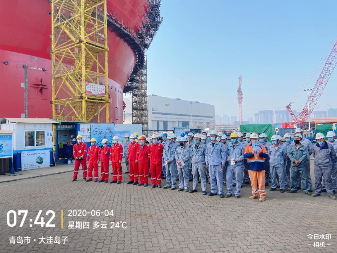 6月 4日,企鹅项目与甲方海工青岛公司,总包方 Fluor,业主方 Shell共同在现场举行了企鹅项目安全生产月启动仪式,并现场发放“安全观察 卡”,总包方建造经理 Mr.Gramha发表了讲话,并进行了现场合影。